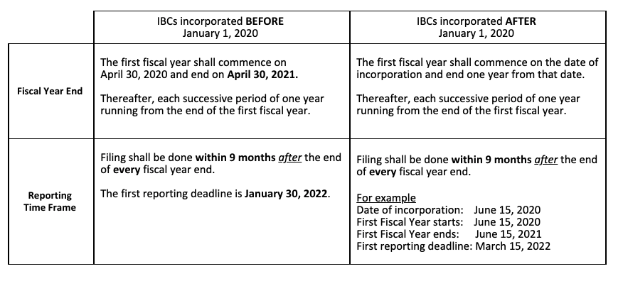 The time frame for reporting adherence to the ES Act is determined by the fiscal year-end of an IBC as follows: