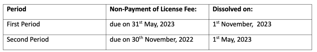 Please note that relevant dates for dissolution of companies struck-off for non-payment of annual license fees are as follows: